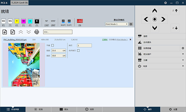 打印機(jī)控制軟件(PCS)擁有友好的用戶界面,交互控制打印機(jī)、監(jiān)測(cè)打印機(jī)狀態(tài)。并可設(shè)置打印機(jī)選項(xiàng),如各噴頭噴射波形的振幅、脈沖寬度及加熱溫度。