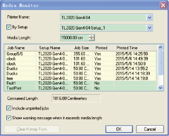ColorPRINT 可以監(jiān)測(cè)介質(zhì)的長度消耗。同一臺(tái)打印機(jī)里包括歷史作業(yè)在內(nèi)的所有作業(yè)將被計(jì)算進(jìn)消耗的長度。當(dāng)介質(zhì)消耗的長度超過介質(zhì)總長度時(shí),用戶將會(huì)收到警告信息。